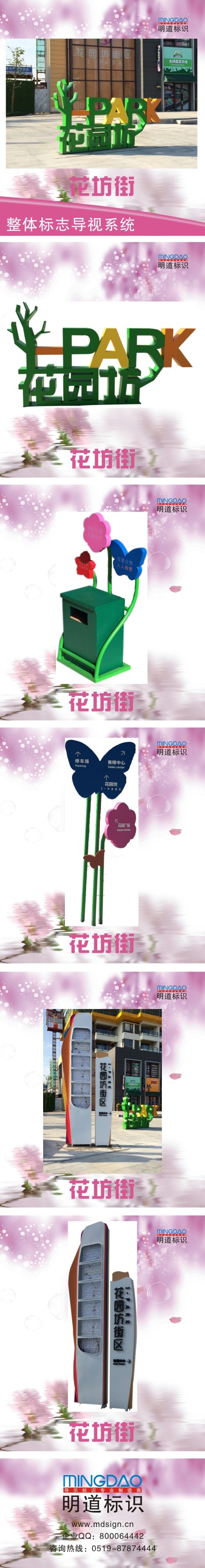 明道標識設(shè)計的花園坊社區(qū)商業(yè)街標識系統(tǒng)主要包括:主題招牌,精神堡壘,多向指示牌,環(huán)衛(wèi)垃圾箱等。