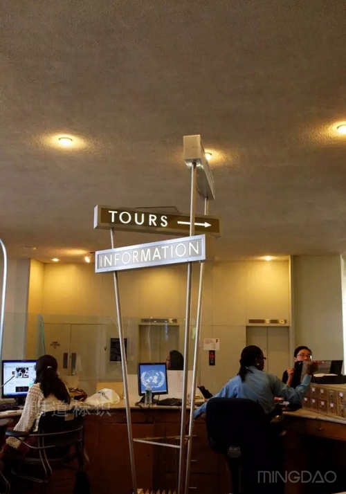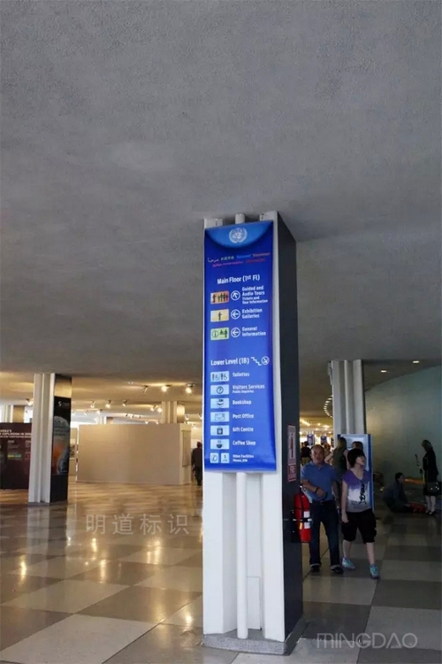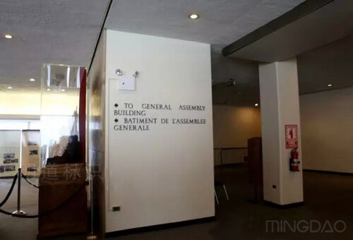 標(biāo)識相結(jié)合的方式,這和聯(lián)合國總部大樓內(nèi)眾多的活動息息相關(guān)。同時標(biāo)識設(shè)置主要采用貼墻的方式,能減少占用空間,更好的起到人流引導(dǎo)的作用。