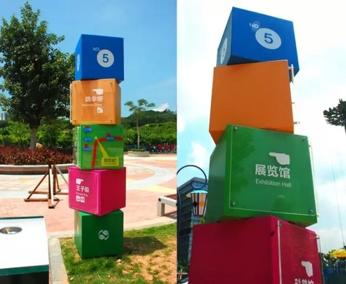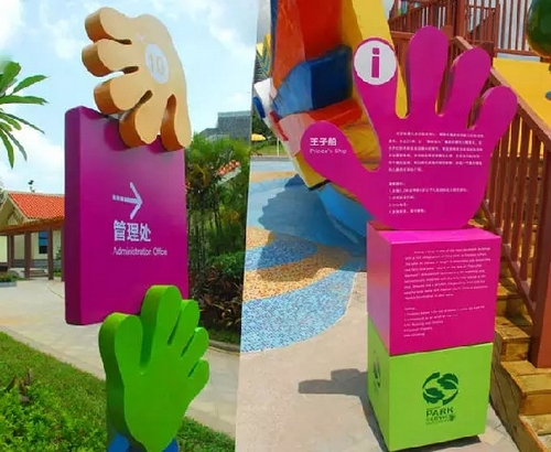 游樂場標(biāo)識首先要服務(wù)于公眾,它并非僅僅是一樣藝術(shù)作品,它要求更多的依照人體工程學(xué)、感性知覺等方面原理,以設(shè)計(jì)出滿足觀看者需要的標(biāo)識導(dǎo)視系統(tǒng)。相比較而言,室外環(huán)境中的標(biāo)牌要比室內(nèi)標(biāo)牌復(fù)雜得多,在整個(gè)城市標(biāo)識系統(tǒng)也占據(jù)著更為重要的位置,之所以說它復(fù)雜,是因?yàn)樗粌H僅是環(huán)境中的因素、環(huán)境里的參與者,更是環(huán)境的創(chuàng)造者,去體現(xiàn)整個(gè)環(huán)境的主題式物體。