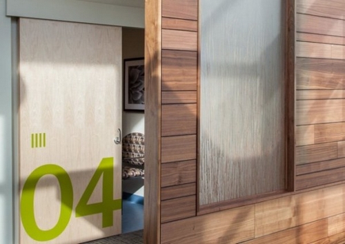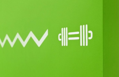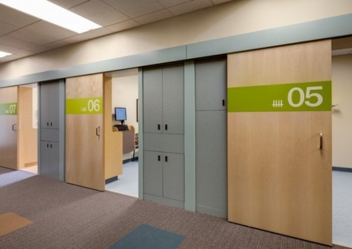 以文字圖形混搭,配合實木色推拉木門,以及室內(nèi)環(huán)境里的木紋裝飾和整體著色,使得環(huán)境格調(diào)統(tǒng)一,輕松自然。值得稍加介紹的還有醫(yī)院樓體