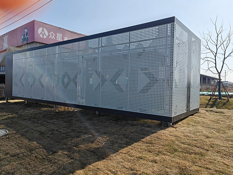 圍擋箱主要由灰色框架和白色穿孔板構(gòu)成,穿孔板上有著規(guī)則排列的細(xì)小孔洞,形成了獨(dú)特的紋理。穿孔板上還裝飾有一些幾何形狀的鏤空?qǐng)D案,包括箭頭和菱形,增加了視覺(jué)上的層次感和設(shè)計(jì)感。
