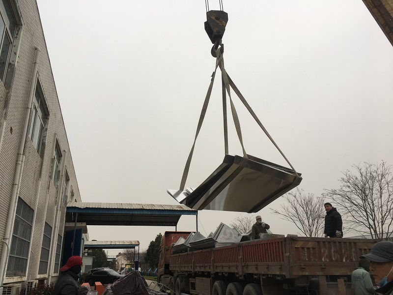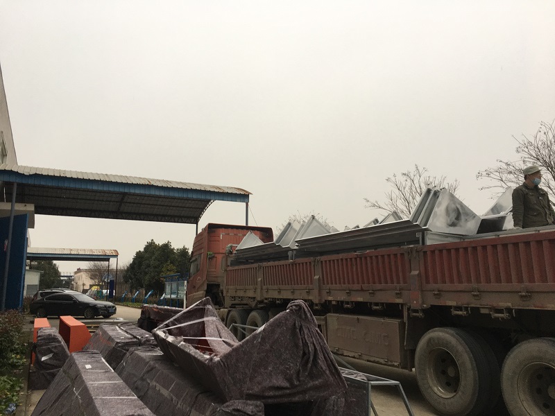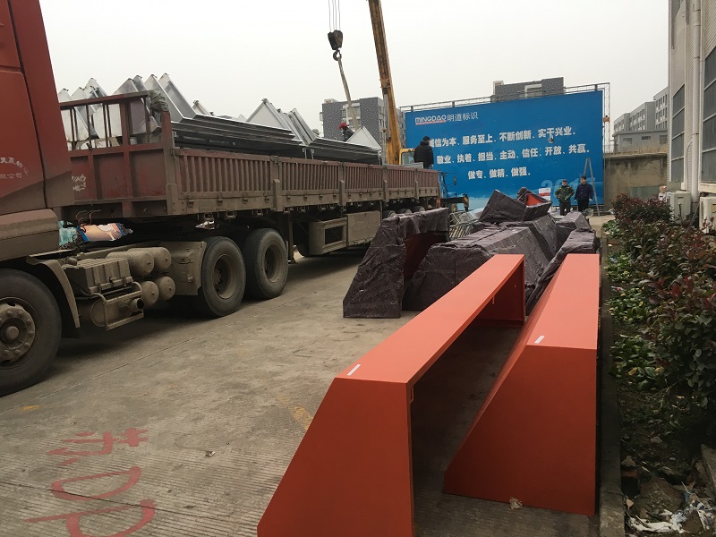 明道標(biāo)識(shí)為幸福里街區(qū)制作的不銹鋼雨棚已完工,工人正在裝車、發(fā)貨。